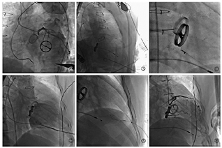 Ⓐ选择性左冠状动脉造影明确心尖无冠状动脉区域 Ⓑ经心尖左心室造影 Ⓒ顺行释放封堵器封堵瓣周漏口 Ⓓ封堵后左心室造影 Ⓔ封堵心尖穿刺针道 Ⓕ术后选择性左冠状动脉造影