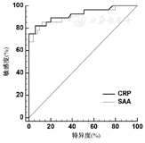 通过Logistic回归模型筛选出CRP与SAA升高是重型发生的危险因素,CRP的OR值为1.166(95%CI,1.073~1.267),P=0.000;SAA的OR值为1.016(95%CI,1.008~1.024),P=0.000。ROC曲线分析CRP的曲线下面积(AUC)为0.924(95%CI,0.840~0.972),敏感度为82.14%,特异度为93.88%;SAA的AUC为0.915(95%CI,0.829~0.966),敏感度为85.71%,特异度为87.76%,见图2。