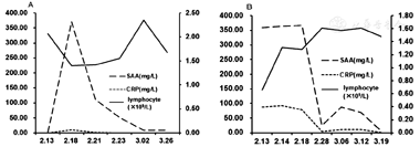 回顾性分析了2例患者从入院到出院不同时间点SAA、CRP和淋巴细胞计数的动态变化,由于PCT在部分时间点没有进行检测,故PCT没有纳入连续观察的指标,见图3。2例患者的基本情况如下:普通型患者A,女性,44岁。无发热、乏力、肌痛,主因咳嗽无痰6天,于2020年2月13日入院,查胸部CT左肺下叶背段、后、外基底段炎症,双肺少许微结节如条索影,咽拭子2019-nCoV核酸检测阳性。经积极治疗后,患者两次核酸阴性,胸部CT好转,于3月13号出院,出院后居家隔离,于3月26号复查病情稳定无反复。