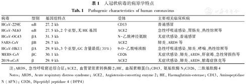 CoV共分为4个属:α、β、γ和δ,能够引起人类感染的CoV均来自于α和β属[1],迄今为止总共发现7种,其中2种属于α属,即HCoV-229E、HCoV-NL63,另外5种属于β属,即HCoV-OC43、HCoV-HKU1、SARS-CoV、MERS-CoV和2019-nCoV。不同HCoV的基因组存在差异,感染细胞的受体不同,引起的临床表现也存在较大差别(见表1)。在感染人的5种β属CoV中,SARS-CoV、MERS-CoV和2019-nCoV属于高致病性CoV,感染性强,所致病情严重,病死率高;而HCoV-OC43和HCoV-HKU1则为低致病性CoV,主要可引起普通型上、下呼吸道感染。