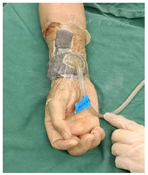 于2022年7月11日给予盐酸莫西沙星氯化钠注射液400 mg/d抗感染。2022年7月12日患者血培养提示革兰阳性球菌,改用万古霉素1 g/d静滴抗感染。2022年7月12日—2022年7月18日患者间断行CRRT(CVVH模式)治疗,清除大分子毒素,共治疗82 h 30 min,超滤7516 ml。2022年7月14患者突发神志谵妄、烦躁不安、不受控制,予地西泮注射液20 mg静推。2022年7月15患者外出检查途中烦躁不安、异常躁动,有自杀及伤人倾向,医护人员及家属极力控制,患者仍将右侧颈内静脉置管拔出、管道完整,立即予压迫止血、予地西泮注射液10 mg静推、予保护性约束,给予盐酸右美托米啶注射液起始量为0.02 mg/h持续微量泵入镇静。2022年7月18日患者神志清楚,予停止盐酸右美托米啶注射液持续微量泵入、停止保护性约束。松绑右上肢动静脉内瘘过程中喷血,周围有坏死组织,患者手肿伴疼痛难忍,皮肤张力增高,静脉血培养提示金黄色葡萄球菌、纹带棒杆菌,考虑血行感染所致瘘口感染。于当日在局麻下行右上肢体动静脉修补术+右上肢体动静脉内瘘成形术+感染灶清除术。术后破溃伤口较大,张力高,无法行一期缝合,给予严格无菌原则换药。伤口愈合不良,复查炎症指标升高,2022年7月22日抗生素改为哌拉西林他唑巴坦2.25 g、2次/d+万古霉素0.5 g/d。经烧伤科会诊后于2022年7月27日在局部神经阻滞下行右上肢清创负压吸引术(中号KCI负压),术后术肢无疼痛,患者仍间断发热,复查炎症指标升高(图5、图6)。于2022年8月3日加用美罗培南0.5 g、2次/d联合万古霉素0.5 g/d抗感染治疗,术后患者体温逐渐下降。2022年8月4日于全麻下行右上肢清创植皮术,术后右上肢植皮区及头皮供皮区愈合良好,2022年于8月9日拆钉(图7)。复查炎症指标恢复尚可,2022年8月10日抗生素降阶梯为哌拉西林他唑巴坦2.25 g、2次/d+万古霉素0.5 g/d。动静脉已完全成熟,拔除右侧颈内静脉置管,使用动静脉内瘘行血液透析治疗。