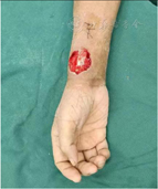 现病史:20+年体检发现多囊肾,肾功能正常,无特殊不适。10年前体检发现血肌酐100+μmo1/L,同时发现血压高(具体不详),患者每年体检血肌酐呈爬行性升高,患者无特殊不适,未给予特殊诊治。2022年3月患者无明显诱因出现全身皮肤瘙痒,逐渐出现双下肢水肿,伴活动后心累、气促,呈高枕卧位,伴头昏、心慌、心悸,2022年5月于当地医院查血肌酐1000+μmo1/L,遂行右侧颈内静脉置管透析每周3次。2022年6月初患者右侧颈内静脉导管脱出,于当地医院行左侧颈内静脉置管透析每周3次,并于2022年6月9日行右前臂动静脉内瘘成形术,术后愈合良好。3 d前患者无明显诱因出现发热,伴畏寒、寒颤,体温最高39.0°C,全天持续无缓解,并发现动静脉内瘘切口处皮肤破溃流脓,伴腹泻,2~3次/d,呈水样便,伴全身乏力疼痛,伴食欲减退,无咳嗽咳痰,无咽痛、流涕,小便量少(100~200 ml/d),当地医院考虑导管感染,遂拔除左侧颈内静脉导管,并行导管尖端培养。患者为求进一步诊治,遂就诊于我科门诊,门诊以"尿毒症、发热待查,导管相关性感染?"收住入院。给予二级护理,低盐低脂饮食,盐酸莫西沙星氯化钠注射液400 mg/d抗感染,行右侧颈内静脉置管血液透析治疗。7月14日患者突然出现意识谵妄,烦躁不安,胡言乱语,予一级护理持续心电、血压、呼吸、氧饱和度监测,予地西泮注射液10 mg静推镇静治疗,予保护性约束。7月15日患者检查途中意外拔出颈内静脉置管,立即予压迫止血,给予盐酸右美托米啶注射液起始量为0.02 mg/h持续微量泵入镇静,再次行右侧颈内静脉置管,持续床旁CRRT(CVVH模式)治疗。7月18日患者神志清楚,予停止盐酸右美托米啶注射液持续微量泵入、停止保护性约束,松绑右上肢动静脉内瘘过程中喷血,周围有坏死组织,患者手肿伴疼痛难忍,皮肤张力增高,静脉血培养提示金黄色葡萄球菌、纹带棒杆菌,考虑血行感染所致瘘口感染。当日在局麻下行右上肢体动静脉修补术+右上肢体动静脉内瘘成形术+感染灶清除术。术后破溃伤口较大,张力高,无法行一期缝合,给予严格无菌原则换药,伤口愈合不良,复查炎症指标升高,经烧伤科会诊后于7月27日在局部神经阻滞下行右上肢清创负压吸引术(中号KCI负压)。8月4日于全麻下行右上肢清创植皮术,术后右上肢植皮区及头皮供皮区愈合良好,于8月9日拆钉,植皮创面愈合良好。