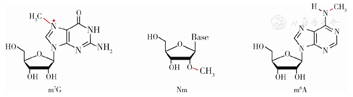 之前的研究表明,RNA甲基化修饰对于病毒感染至关重要。早在1974年,Miura等人就在一种双链RNA病毒——胞质型多角体病毒中发现了5’端加帽修饰[8,9],随后的一系列研究表明,病毒基因组RNA存在多种修饰,包括N7-甲基鸟嘌呤(m7G)、2’-O-甲基(Nm)、N6-甲基腺嘌呤(m6A)等(图1),这些修饰在病毒侵染宿主过程中起到了重要的作用。