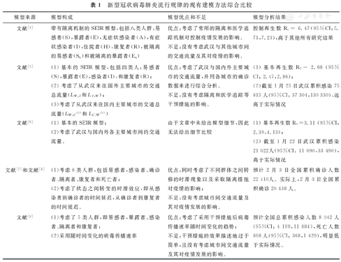 文献[5](1)基本的SEIR模型,包括四类人:易感者(S),暴露者(E),感染者(I),和康复者(R);(2)考虑了从武汉来往国外主要城市的交通总流量(LWILIW);(3)考虑了从武汉来往国内主要城市的交通总流量(LW,C(t)LC,W(t))优点:考虑了武汉与国内外主要城市的交通流量,并用各城市的确诊数据来进行综合分析。不足:没有考虑隔离和医学追踪等干预措施的影响。(1)基本再生数R0= 2.68 (95%CI: 2.47,2.86);(2)截至1月25日武汉累积感染75 815人(95%CI: 37 304,130 330),远高于实际情况