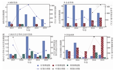 近5年我国省级CDC共承担其来源资助课题83项,经费2 026.42万元,平均每项课题资助强度为24.41万元。2016年承担其他来源的课题数量最多,为23项,到2017年数量和经费最低,分别为7项和117.00万元,到2018年经费达到最高,为850.20万元。按地区分布,2015年和2016年东部地区承担其他来源的课题数量最多,2017—2019年中部地区课题数量最多;除2015年东部地区课题经费最高外,2016—2019年中部地区课题经费最高(F=3.55,P=0.031,图2D)。