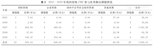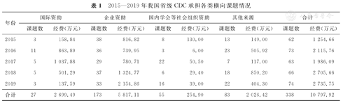 疾病预防控制体系是人民健康和公共安全的第一道防线[8]。新型冠状病毒肺炎疫情发生后,习近平总书记强调:"要把我国疾控体系建设作为一项根本性建设来抓,加强各级防控人才、科研力量、立法等建设,推进疾控体系现代化"。横向科研经费是科研工作的重要经济基础。相对纵向科研课题而言,横向科研课题通常由是企事业单位、国际机构或学会团体等委托的各类科学研究、科技开发、科技咨询、技术服务等方面的项目[9],其数量和经费额度没有明确限制,开发空间大,获得途径灵活,科研成果与实际生产结合更加密切,更有利于将疾病防控科研成果和实践经验转化为社会经济公共产品。因此,以横向科研课题为牵引提升疾控科学研究和社会服务能力具有重要意义。本文通过对2015—2019年我国省级CDC承担和参与的横向科研课题数量和经费进行分析,为我国疾控体系科技发展以及科研管理提供依据。