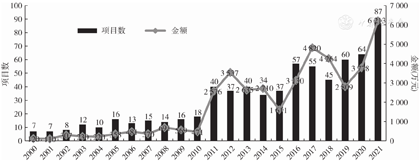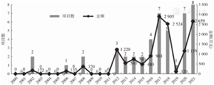 重点重大类项目围绕国家重大战略需求和重大科学前沿,开展深入、系统的创新性研究,能够提升我国基础研究源头创新能力,促进学科发展或形成新学科生长点[8]。重点重大类项目包括重点项目、重大项目、重大研究计划项目、优秀青年科学基金项目、国家杰出科学基金项目、国家重大科研仪器研制项目等。2000—2021年,西安交大获医工结合重点重大类项目46项。资助数量和资助金额呈现起伏式增长,时而剧增时而骤减(图3)。总的来说,每隔4~5年迎来一次高峰期。可以看出,近年来总体获资助金额分布与重点重大类项目资助金额的分布息息相关。