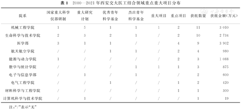 2000—2021年西安交大医工结合领域重点重大项目分布