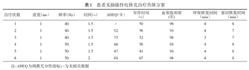 | 治疗次数 | 波宽(ms) | 频率(Hz) | 时间(s) | ADEQ(%) | 发作时间(s) | 血氧饱和度(%) | 呼吸恢复时间(min) | 意识恢复时间(min) |