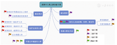 指导原则将新冠肺炎疫情的影响人群划分为六类四级,要求将第一级人群作为心理危机干预的重点,逐级扩展到第二、三、四级人群,并对不同类别人群受疫情影响出现的常见心理行为问题,以及心理危机干预措施和原则进行了详细阐述。六类人群的四级干预对应划分见图1。