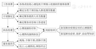 如何组织实施紧急心理危机干预,具体的流程和步骤涉及工作部署、计划制定、队伍组建与服务开展等4个方面,见图2。