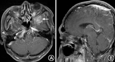 该例入院时头颅MRI(图1)提示左侧前中颅窝底占位性病变,骨质有破坏,影像学表现考虑脑肿瘤可能性大。脑脊液改变提示炎症可能性大。在治疗过程中,患者发热,白细胞持续升高,脑脊液改变考虑不除外合并细菌感染,给予头孢吡肟3 d治疗效果不明显。考虑该例有牛羊接触史,发热时伴恶心、大汗、腰痛,症状与布氏杆菌病相似,查血清布氏杆菌凝集试验为阳性,使用多西环素联合利福霉素试验性抗布氏杆菌病治疗,治疗16 d后发热、头痛较前好转,复查头颅MRI(图3)显示对侧出现新发病灶,脑脊液提示蛋白及细胞数均较前降低,脑肿瘤短期内出现新发病灶,且经抗感染治疗临床症状缓解的可能性不大,加之复查血清布氏杆菌凝集试验仍为阳性,SAT>1∶160,脑脊液布氏杆菌抗体阳性,明确诊断为神经型布氏杆菌病。给予多西环素、利福霉素联合头孢曲松抗感染治疗10 d后,发热及头痛明显好转,复查脑脊液压力较前降低,脑脊液常规接近正常。规范治疗4周后复查MRI(图4)发现颅内占位病变消失,随访3个月,患者无发热,无头痛。