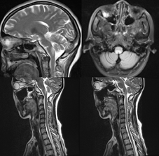 转入后予大剂量丙种球蛋白冲击治疗5 d,中等剂量的甲泼尼龙(160 mg/d)治疗,恶心、呕吐症状稍有好转,于2016年3月17日自动出院去北京某医院诊治,在北京某医院诊断为PSS、NMOSD,给予甲泼尼龙、环磷酰胺等治疗后明显好转,出院后一直口服小剂量甲泼尼龙、环磷酰胺维持,吞咽、言语等好转,生活自理,行走自如,1年后来我院复诊时病情持续稳定,复查全脊髓MRI并强化未见异常信号,复查SSA抗体、抗RO-52抗体、抗核抗体仍阳性。