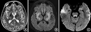 患者男性,16岁,因"阵发性木讷,四肢僵硬、构音障碍10个月"于2016年8月29日入院。患者于10个月前无明显诱因出现阵发性木讷,目光呆滞,持续数十秒后自行好转,而后出现上肢不自主抖动,呈持续性,逐渐出现双上肢先后僵硬,呈屈曲状,不能伸直,后双下肢僵硬,行走不稳。构音障碍,言语不能,饮水呛咳,症状呈进行性加重,自起病来,无发热、头痛,无晕倒、口吐白沫,无肢体偏瘫,无大小便失禁。既往史家族史无特殊。神经系统体检:意识清楚,认知功能尚可,言语不能;K-F环(+);四肢肌张力高,双上肢肌力Ⅳ级,双下肢肌力Ⅴ级,四肢腱反射(+),病理征阴性。生化检查:尿铜792.28 μg /24 h(正常值15~30 μg/24 h);血清铜蓝蛋白测定0.12 g/L (正常值0.2~0.6 g/L);尿常规:隐血3+,蛋白质(±),红细胞832.92个/μl[正常值0~5个/μl];血常规:白细胞计数3.51×109/L[正常值(4~10)×109/L],红细胞计数4.08×1012/L[正常值(4.09~5.74)×1012/L],血红蛋白123 g/L(正常值131~172 g/L),血小板计数78×109/L[正常值(85~303) ×109/L]。凝血四项:纤维蛋白原浓度1.43 g/L(正常值2~4 g/L),凝血酶原时间14.6 s (正常值9~13 s ),国际标准比率1.25 (正常值0.8~1.2),凝血酶原活动度60.1% (正常值70%~150%)。肝功能:碱性磷酸酶210.53 U/L(正常值34~104 U/L),谷氨酰转酞酶58.97 IU/L(正常值5~55 IU/L),纤维结合蛋白127.03 mg/L(正常值180~280 mg/L)。粪便常规+潜血、肾功能、电解质、肌酶谱、C反应蛋白、红细胞沉降率、血脂、餐后2 h血清葡萄糖、叶酸、维生素B12、游离甲状腺素测定等未见异常。患者心电图示窦性心律,大致正常心电图。脑电图:间歇期,左额区见较多中波慢波及尖波,尖慢波;诊断提示:间歇期,痫样放电及慢波,脑区性,左额著。上腹部CT提示肝硬化、脾肿大。颅脑磁共振平扫:双侧额、顶、颞叶脑沟变窄,脑组织肿胀,呈稍长T1稍长T2信号(图1A),DWI呈脑回样高信号(图1B),双侧豆状核、丘脑及外囊、胼胝体、脑干背侧呈片状稍长T1、稍长T2信号,双侧苍白球及小脑齿状核呈等T1、短T2信号(图2)。颅脑增强扫描:双侧额顶叶脑回线样明显强化(图1C)。