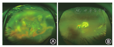 辅助检查:①心电图:正常。②超声心动图:三尖瓣微量反流,主动脉瓣轻度反流,组织多普勒未见异常。③肺部低剂量CT平扫:右肺下叶背段炎症。④韦氏儿童智力量表:测验总分11分;智商:54分。⑤肌电图:肌源性损害。⑥外周血染色体核型分析:46XY。⑦荧光素眼底血管造影:双眼渗出性视网膜改变,左眼血管迂曲、呈异常瘤样扩张,伴有渗漏和黄白色脂质渗出;右眼渗出性视网膜脱离(图1)。⑧影像学检查:双侧大腿+小腿MRI平扫:双侧大、小腿肌肉未见明显异常。颈椎+胸椎+腰椎正侧位片:颈椎、胸椎未见明显异常,腰椎稍侧弯。头颅MRI:正常。