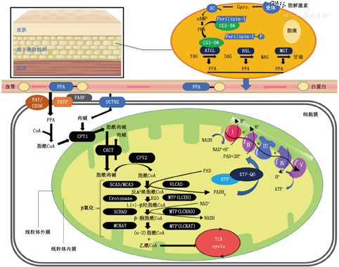 被释放入血的游离脂肪酸与白蛋白结合后转运至目标组织的细胞外间隙,细胞表面的脂肪酸转运蛋白(fatty acid transport proteins)再将游离脂肪酸转运至细胞内进行β氧化(图1)。