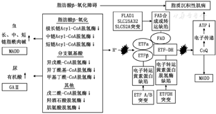 AC:腺苷酸环化酶;PKA:蛋白激酶A;Perilipin-Ⅰ:脂周素-Ⅰ;CGI-58:comparative gene identification-58;ATGL:脂肪甘油三酯脂酶;HSL:激素敏感性脂肪酶;MGL:单甘油酯脂肪酶;TAG:甘油三酯;DAG:甘油二酯;MAG:甘油一酯;FFA:游离脂肪酸;FAT/CD36:脂肪酸转位酶;FATP:脂肪酸转运蛋白;FABPpm:质膜脂肪酸结合蛋白;OCTN2:有机阳离子转运蛋白;CoA:辅酶A;CACT:肉碱脂酰肉碱转位酶;CPT1/2:肉碱脂酰转移酶1/2;VLCAD:极长链酰基辅酶A脱氢酶;MCAD:中链酰基辅酶A脱氢酶;SCAD:短链酰基辅酶A脱氢酶;MTP:线粒体三功能蛋白;LCEH:长链烯酰基辅酶A脱氢酶;LCHAD:长链羟酯酰辅酶A脱氢酶;LCKAT:长链-β-酮硫解酶;Crotonase:烯酰水合酶;SCHAD:短链羟酯酰辅酶A脱氢酶;MCKAT:中链-β-酮硫解酶;FAD:黄素腺嘌呤二核苷酸;FADH2:还原型黄素二核苷酸;ETF:电子转运黄素蛋白;ETF-QO:电子转运黄素蛋白脱氢酶;图2同