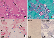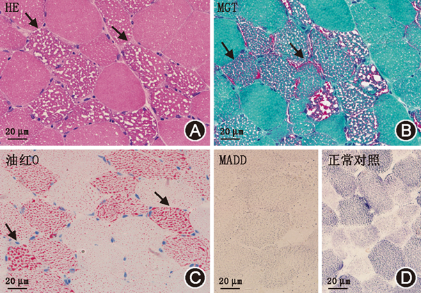 晚发型MADD肌肉活检常呈现典型的LSM病理改变。HE染色可见肌纤维内散在的细小圆形空泡(图3A),病情严重者可见融合的不规则大空泡,肌纤维呈破碎样外观,坏死和再生纤维罕见。改良格莫瑞三色染色可见较多散在的均匀红染纤维,偶见典型的不整红边纤维(图3B)。油红O染色显示肌纤维内的空泡为脂肪滴,以Ⅰ型肌纤维为主(图3C)。半数左右患者琥珀酸脱氢酶染色可见酶活性弥漫性减低(图3D)。COX染色大致正常,PAS染色示肌纤维内糖原含量正常[7,8]。