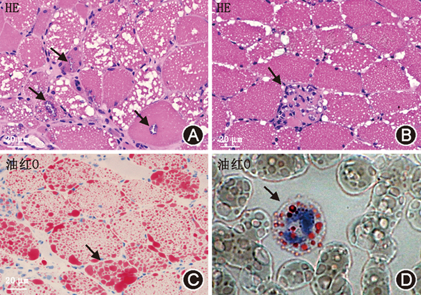 NLSDM患者1~66岁均可发病,以中年起病多见,中位发病年龄为30岁。起病隐匿,病程缓慢进展。约1/3的患者有父母近亲婚配史。肌无力和肌萎缩不对称者占40%~100%,四肢远、近端均可受累,远端受累占16%,半数以上可有翼状肩胛,1/3的患者有颈伸肌和脊旁肌萎缩和无力。可伴有高脂血症、糖尿病和神经性耳聋以及心脏、肝脏、胰腺等其他器官受累表现。尿有机酸和血脂酰肉碱正常。肌肉病理检查除了肌纤维内大量脂肪聚集外(图4A),还可见轻至中度的肌纤维坏死(图4B)、再生和萎缩,内核纤维轻度增多,部分患者可见镶边空泡(图4C)。外周血涂片油红O染色可见中性粒细胞胞质内脂滴沉积,又称Jordan现象(图4D)。本病由PNPLA2突变引起,可以为点突变、剪切突变和无义突变等。本病目前无有效治疗[12]。NLSDM与晚发型MADD鉴别要点见表1。