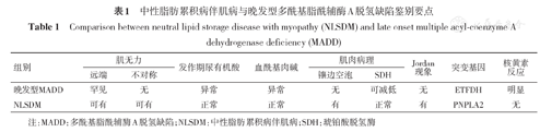 中性脂肪累积病伴肌病与晚发型多酰基脂酰辅酶A脱氢缺陷鉴别要点