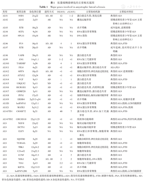 此外,目前已明确的ALS致病基因,还包括VAPB、ANG、FIG4、VCP、TBK1、NEK1、TIA1及KIF5A等(表1)。尽管这些基因已经被证实与ALS相关,但是尚缺乏多中心、大样本的研究探究基因型与临床表型的关系,有些基因致病机制也尚不十分明确,有待进一步研究。