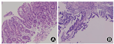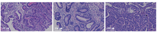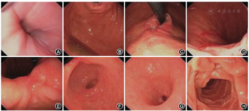 胸部、全腹CT平扫+增强示:(1)胃小弯侧占位,考虑癌并周围淋巴结肿大。(2)右肺下叶小肺大泡,左肺上叶舌段轻微炎症。(3)肝左叶小囊肿。(4)左侧肾上腺稍增粗。(5)前列腺钙化灶。胃镜及病理活组织检查(活检)诊断:(1)慢性食管炎;(2)贲门胃底、胃角溃疡伴高级别腺上皮内瘤变(图2,图3)。