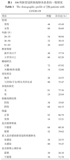 参加调查的106例COVID-19患者中,男性46例(43.40%),女性60例(56.60%),年龄21~65(35.90±11.92)岁,文化程度在大学及以上者占62.26%(66/106),已婚者占67.92%(72/106),独居者占24.53%(26/106),有心理咨询需求者占28.30%(30/106)。具体结果详见表1。