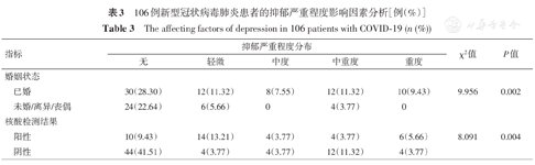 106例新型冠状病毒肺炎患者的抑郁严重程度影响因素分析[例(%)]