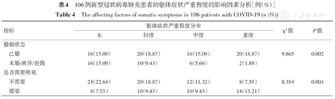 106例新型冠状病毒肺炎患者的躯体症状严重程度的影响因素分析[例(%)]