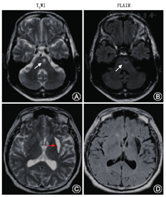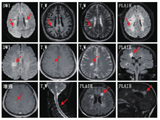 (1)腔隙性脑梗死:病灶直径3~15 mm,呈边缘清晰的圆形、裂隙状或椭圆形,MRI/T1WI呈低信号而T2WI呈高信号;急性期的DWI为高信号。陈旧性腔隙性脑梗死:在FLAIR上病灶呈低信号,周围有胶质增生的高信号。病灶主要分布于基底节、丘脑、内囊、豆状核和尾状核、脑干等脑穿支动脉供血区域。(2)多发性硬化:脑和脊髓均可有病灶,为多病灶,呈非对称性,通常有相对固定的分布模式及形态;病灶与侧脑室垂直分布;在T1WI为低信号,T2WI为高信号(煎蛋状、云雾状),FLAIR为高信号,急性期DWI呈高信号,增强后呈C形或开环状强化。