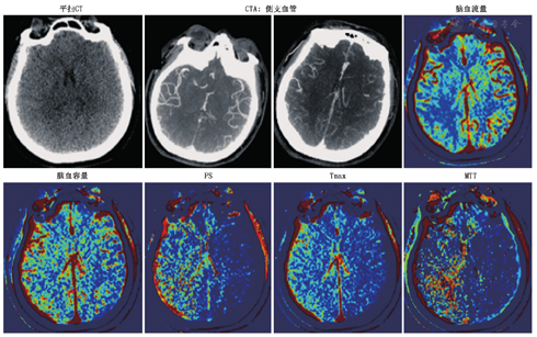 "一站式"多模态CT由NCCT、CTP及CTA组成(图13),目前应用广泛,方便快捷,为动脉取栓、动脉瘤介入或外科手术提供精准诊疗。NCCT可鉴别患者是否存在脑出血;CTA可以鉴别是否有动脉瘤或大血管闭塞;CTP可以提供脑血流的灌注情况、是否存在半暗带、侧支循环及血脑屏障完整性等信息,为进一步制定患者的诊疗方案,判断预后奠定基础。