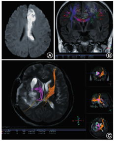 DTI是DWI技术的发展与深化,是当前唯一一种检测和追踪脑白质纤维束的非侵入性检查方法,可以定量评价脑白质的各向异性。组织中的水分子运动是多个方向的,也称水分子弥散的各向异性。DTI至少可以同时测量6个方向的水分子运动,从解剖和细胞水平,个体化地提供活体人脑白质纤维结构位置和走行特点的影像学信息[18]。目前临床主要用于指导脑外科手术,避免脑白质纤维束受损(图4)。
