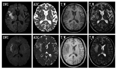 ADC也是反映体内水分子运动的一个参数,是检测水分子向各个方向弥散的平均值,水分子弥散运动越明显,ADC值增高[19]。ADC对临床早期鉴别缺血性脑卒中或炎性病变具有重要帮助(图5)。急性缺血性脑卒中ADC表现为低信号,而脑炎可为高信号。