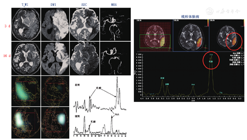 MRS可以活体检测脑组织代谢物的化学成分和含量。代谢物主要包括N-乙酰天冬氨酸、肌酸(Cr/Pcr)、胆碱(Cho)、肌醇(mI)、乳酸(Lac)。MRS可以帮助临床判断脑卒中的预后以及对代谢性脑病、脑肿瘤的鉴别诊断[20](图6)。