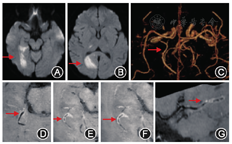 HR-VWI是MRA、CTA和DSA对血管检测的一种重要的补充技术,可以检测血管和血管壁的结构变化,明确动脉粥样硬化斑块的性质,鉴别血栓和栓子,明确烟雾病的病因,检测动脉夹层、动脉炎、侧支血管等,为临床诊断和治疗提供重要信息和依据(图8)。HR-VWI可以检出脑动脉炎性改变,但不能鉴别是否为大动脉炎或继发性脑动脉炎,如结核、胶质瘤等,一般需结合临床进行诊断和鉴别诊断。