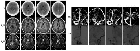 MRI包括常规T1和T2加权成像、液体衰减反转恢复序列(fluid-attenuated inversion recovery,FLAIR)、MRA、磁共振静脉成像(magnetic resonance venography,MRV)、弥散加权成像(diffusion-weighted imaging,DWI)、弥散张量成像(diffusion tensor imaging,DTI)、灌注加权成像(perfusion-weighted imaging,PWI)、磁共振波谱成像(magnetic resonance spectroscopy,MRS)、血氧水平依赖成像(blood oxygen level dependent,BOLD)、磁敏感加权成像(sensitivity weighted image,SWI)、高分辨血管壁磁共振成像(high resolution magnetic resonance vascular wall imaging,HR-VWI)等[3]。