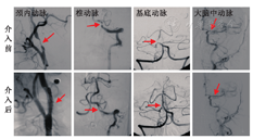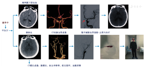 与磁共振动脉成像(magnetic resonance angiography,MRA)相比,CTA能够更好地显示脑血管三维空间的立体结构,可以进行任意方位和角度旋转,可以清晰地显示血管狭窄或动脉瘤,进行明确定位[10,11]。CTA的缺点为需要造影剂,受颅底骨质影响,如在海绵窦段的颅内动脉瘤,常常容易漏诊。但对SAH后的动脉瘤检测优于MRA。所以对于急诊疑似脑卒中的患者,为进一步明确是否有大血管狭窄或动脉瘤,均建议行CTA检查,指导取栓或动脉瘤介入/手术治疗。