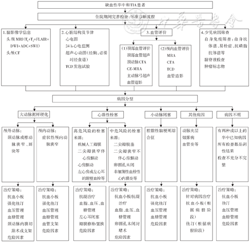 缺血性卒中正确的临床病因分型对患者的二级预防至关重要,不同的病因需要采用不同的二级预防策略。因此对缺血性卒中患者进行病因评估与筛查,是缺血性卒中二级预防策略制定的基础。目前,在临床试验和临床实践中应用广泛的卒中分型系统是急性卒中治疗Org10172试验(Trial of Org10172 in Acute Stroke Treatment, TOAST)分型[4]和中国缺血性卒中亚型(China ischemic stroke subclassification, CISS)分型[5](图2)。通过患者在院期间标准的病因筛查与评估流程(图3),可以帮助我们明确缺血性卒中的病因,从而为指导缺血性卒中二级预防方案制定奠定基础。