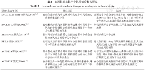 | ACTIVE‑W研究(2006)[19] | 在伴有至少一种危险因素的心房颤动患者中,评价双联抗血小板治疗的疗效是否不劣于口服华法林抗凝治疗 | 在心房颤动相关性脑卒中预防时,华法林较阿司匹林联合氯吡格雷的疗效和安全性更优 |