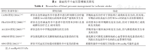 | PRoFESS研究(2008)[31] | 评价在急性缺血性卒中患者中使用替米沙坦(在基础降压治疗之上)的有效性 | 采用替米沙坦早期降压是安全的,但对于预防死亡或残疾是无效的 |