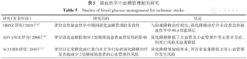 对于合并糖尿病的缺血性卒中患者,二级预防可将血糖控制到接近正常血糖水平,以降低心血管事件发生风险。糖尿病患者心血管风险干预研究(Action to Control Cardiovascular Risk in Diabetes, ACCORD)[37]和糖尿病与血管疾病行动研究(Action in Diabetes and Vascular Disease, ADVANCE)[38]等旨在探讨强化血糖控制相比常规治疗对长期糖尿病患者大血管和微血管并发症的影响,但未能证明强化血糖控制可以获益。近年来,有研究发现降糖药物,包括钠-葡萄糖协同转运蛋白2抑制剂和胰高血糖素样肽-1受体激动剂等与心血管事件风险降低相关,但是可能是通过降低心力衰竭等其他机制发挥作用,而不是通过降低糖化血红蛋白[39]。表5中列出了近年缺血性卒中血糖管理相关研究[36, 37, 38]。