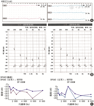 患者于入院第17天再次出现发热,体温最高38.8 ℃,继续完善甲型流感病毒、乙型流感病毒、呼吸道7种病毒、肺炎支原体、肥达反应等检查,均为阴性。入院第18天复查头颅MRI:双侧侧脑室枕角信号异常,较前缩小(图1D~F)。脑脊液检查:脑脊液压力75 mmH2O;脑脊液常规:清亮、潘氏试验阴性;白细胞 41×106/L,多个核细胞5%;脑脊液生化:总蛋白0.9 g/L,葡萄糖2.00 mmol/L,氯化物118.03 mmol/L,排除化脓性脑膜炎复发可能。患者反复发热,诉双侧耳前下疼痛,体检可触及肿物,腮腺CT示双侧腮腺腺体致密,耳鼻喉科会诊考虑合并厌氧菌感染的化脓性腮腺炎可能,故停用青霉素及左氧氟沙星,调整为头孢吡肟。入院第24天体温恢复正常,诉双耳听力减退,查纯音测听提示双耳混合性耳聋。发病3个月后随访,患者仍有双耳听力重度障碍,复查头颅MRI(图1G~I)及脑电图均未见异常;发病6个月后随访,仍遗留双耳重度听力障碍伴阵发性耳鸣,听觉诱发电位示双耳听觉诱发电位消失(图3A),纯音测听提示双耳混合性耳聋(图3B),耳声发射检查双耳未引出(图3C)。