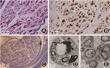 患者于2017年11月28日在局部麻醉下行右侧腓肠神经活组织检查,神经病理检查结果(图1)提示有髓神经纤维中重度丢失,大量不同时期轴索变性,包括伴随空泡结构的有髓神经纤维Wallerian变性、脱失后残留的空洞样结构,未见薄髓鞘神经纤维、有髓神经纤维的再生簇以及洋葱球样结构,未见典型血管炎病理改变及刚果红阳性异常物质沉积;免疫组织化学染色显示不同直径有髓神经纤维和无髓神经纤维重度丢失,神经内衣可见较多CD68+巨噬细胞浸润。神经病理改变符合急性重度活动性轴索性周围神经病特点。
