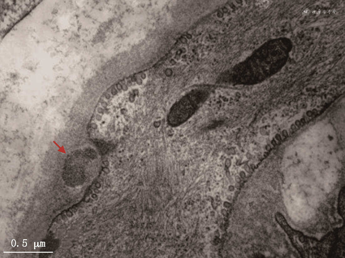 CADASIL主要累及全身微小动脉,在中枢神经系统主要累及小的穿支动脉和软脑膜动脉。电镜下可观察到血管平滑肌细胞变性、丢失,小动脉平滑肌细胞基底膜增厚和出现GOM结构。GOM通常呈直径1~2 μm的蘑菇状或不规则圆形,其底部与血管平滑肌细胞基底膜贴近,头部突向细胞外基质(图1)。毛细血管周细胞也可出现退行性改变,其表面也可出现GOM沉积。免疫电镜显示GOM中含有NOTCH3蛋白胞外段。