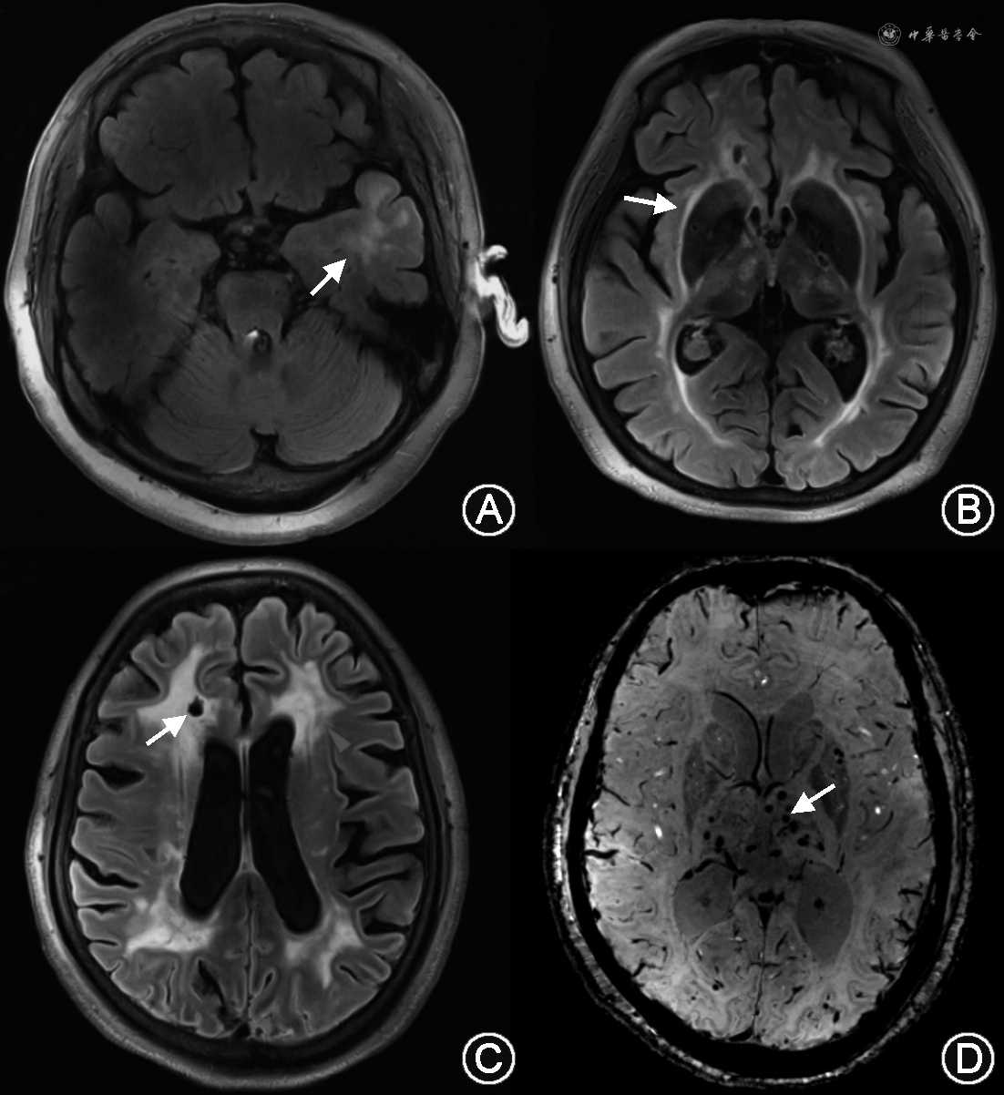 MRI检查包括常规头颅平扫序列和微出血扫描序列,其改变包括(图2):(1)脑白质高信号(white matter hyperintensities,WMHs)是患者最早和最常见的影像学改变,35岁之后基本上所有的CADASIL患者都会有不同程度的WMHs[18],分布在脑室周围白质、颞极、外囊、额顶区白质,U形纤维通常不被累及[19]。一项小样本研究结果表明,颞极白质高信号区别CADASIL和散发脑小血管病的敏感度和特异度分别为90%和100%[20],但亚洲患者颞极受累比例较欧美患者低。WMHs的发生原因与血脑屏障破坏导致的白质水肿以及白质纤维束的病变有关。(2)腔隙性脑梗死(lacunar infarctions,LIs)是患者另一常见的影像学表现,出现在几乎所有疾病晚期的患者中,主要分布于半卵圆中心、丘脑、基底节和脑桥。LIs与WMHs有一定的相关性,Duering等[21]发现大约90%的LIs出现在WMHs的边缘,仅5.8%出现在WMHs中或WMHs以外,提示LIs与WMHs是同一疾病动态发展过程中的不同表现。越来越多的研究结果提示,CADASIL患者的LIs不是由穿通动脉的闭塞造成,而可能与血流动力学改变导致的局部低灌注有关,对CADASIL患者进行7.0 T MRI检查也提示其基底节的病变可能并不是由豆纹动脉的闭塞造成[22]。(3)脑微出血(cerebral microbleeds)出现在约50%的我国患者当中,主要分布在深部脑区。脑微出血数量与患者的年龄和MRI总病灶负荷呈正相关,高血压与脑微出血的发生独立相关,脑微出血负荷(微出血数量≥9个)与脑出血的发生独立相关[23]。(4)血管周围间隙(perivascular space)的扩大可出现在78%的患者中,主要位于颞叶、基底节和皮质下白质,其严重程度随患者的年龄增长而增加,颞叶或岛叶下区扩大的血管周围间隙的严重程度与患者脑白质高信号的严重程度密切相关[24]。由于CADASIL患者多无明确的血管狭窄和闭塞,脑血管造影不推荐,个别研究报道血管造影可能会增加患者神经系统并发症的风险[25]。