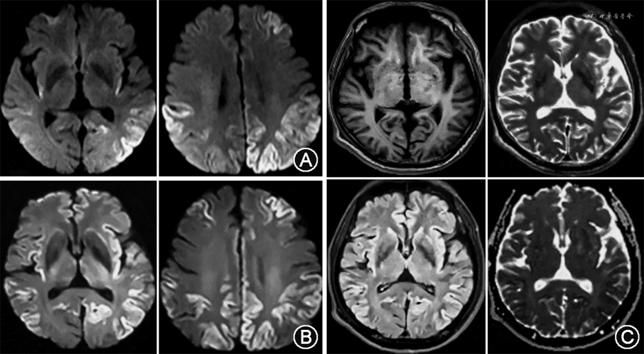 脑脊液检测:2020年3月患者于外院行腰椎穿刺,脑脊液常规生化检测报告未见异常。入院后在知情同意下再行腰椎穿刺,脑脊液初压72 mmH2O(1 mmH2O=0.009 8 kPa),终压为0;脑脊液常规:外观无色透明,细胞总数4×106/L,白细胞总数0(正常值0~8×106/L);脑脊液生化:蛋白0.56 g/L(正常值0.15~0.45 g/L),氯化物122 mmol/L(正常值120~132 mmol/L),葡萄糖 3.3 mmol/L(正常值2.5~4.5 mmol/L),乳酸 1.5 mmol/L(正常值0.6~2.2 mmol/L);脑脊液寡克隆区带、细菌、真菌涂片未见异常;快速梅毒血浆反应素试验、梅毒特异性抗体、单纯疱疹病毒抗体Ⅰ型+Ⅱ型、巨细胞病毒DNA、巨细胞病毒IgM+巨细胞病毒IgG、Epstein-Barr(EB)病毒DNA、EB病毒IgG+EB病毒IgM、脑脊液抗神经元自身免疫性抗体均无异常。采用酶联免疫吸附测定法检测脑脊液β-淀粉样蛋白(Aβ)42、总tau蛋白(T-tau)、磷酸化tau蛋白(P-tau),结果为Aβ42485.5 pg/ml,T-tau 2 911.3 pg/ml,P-tau 67.4 pg/ml,T-tau/Aβ42为6.0。将脑脊液样本送中国疾病预防控制中心进行14-3-3蛋白检测,结果回报脑脊液14-3-3蛋白阳性。