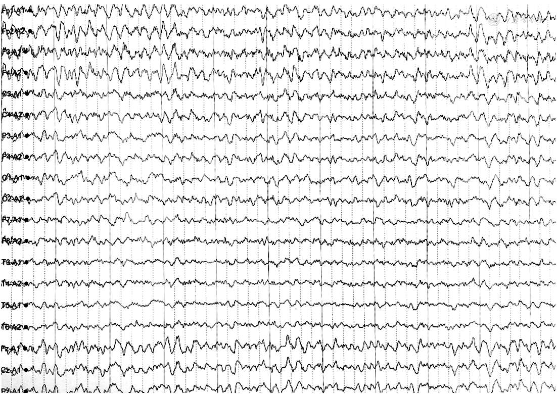 辅助检查:血尿便常规、凝血、肝肾功能、梅毒螺旋体抗体、艾滋病病毒抗原及抗体初筛、乙型肝炎相关抗原及抗体、丙型肝炎抗体、叶酸+维生素B12、抗核抗体谱+抗磷脂抗体谱+系统性血管炎相关抗体谱、常见肿瘤标志物均未见明显异常。毒物筛查未见异常。血抗神经抗原抗体检测:抗N-甲基-D-天冬氨酸受体抗体、抗谷氨酸脱羧酶抗体、抗电压门控钾离子通道抗体及副肿瘤综合征相关抗体Ri、Hu、Yo等免疫检查均未见异常。2020年3月及6月2次行头颅MRI示双侧大脑半球皮质多处花边征并逐渐增多,DWI及FLAIR序列出现高信号(图1)。头颅MRA未见异常。2020年3月外院脑电图报告未见异常。2020年8月于我院复查脑电图提示异常:左颞叶为著不规则慢波;左颞少量尖波(图2)。