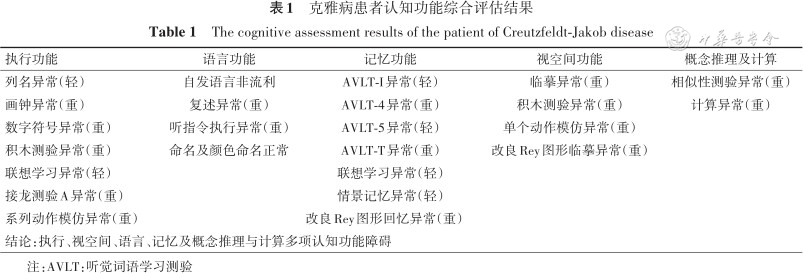 讨论 认知障碍通常为CJD患者的首发和常见表现,有研究者对CJD人群进行神经心理学分析,发现绝大部分患者存在多个认知域受损,其中以执行功能、情景记忆和语言功能受损最为常见[2,6, 7]。我们对本例CJD患者进行了系统的神经心理学评估,结果显示其存在执行功能、视空间及记忆等多个认知域受损。该患者虽然满足痴呆的诊断标准,但执行功能障碍或视空间障碍并不能完全解释其临床表现。对其进行失用相关的神经心理学评估,结果显示该患者存在突出的观念运动性失用;按部位分类,患者同时存在肢体失用和躯干失用。但在长达半年的多次求医过程中,患者的失用症一直被临床医师忽视。问及病史时患者及家属也不能准确表述患者症状,但我们从“走路不知道如何迈步”“叠被等家务活动时间延长”等表现中可以发现端倪。失用症在CJD患者中并不少见,Krasnianski等[3]发现高达56.5%的CJD患者存在失用。绝大部分存在失用的CJD患者同时会出现失语、失算等症状,最终表现为某些综合征如进行性非流利性失语、皮质基底节综合征和后皮质痴呆等[8, 9, 10]。仅少数患者以失用为首发表现或疾病早期的唯一症状[3,11, 12]。合并其他症状容易导致对失用症的忽略。从本例患者的确诊经过可以看出,在对CJD患者的早期识别和诊断过程中,不能忽视对失用症的神经心理评估。