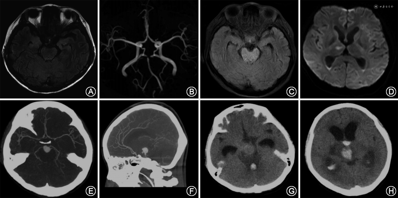 临床资料 患者女性,28岁,因“发热2周,突发意识障碍1 d”于2019年12月29日入院。患者入院前2周感冒后出现咳嗽、发热,体温最高达38.5 ℃,给予抗炎、抗病毒治疗1周后,症状减轻。入院前1 d出现左侧舌面部麻木,伴双下肢无力,就诊于当地医院,行颅脑MRI提示脑内多发异常信号影(图1A),考虑炎性可能性大,颅脑MRA提示基底动脉尖部信号缺失,双侧大脑后动脉由后交通动脉代偿供血(图1B)。之后患者逐渐出现意识障碍,为求进一步诊治,急诊以“颅内感染”收入我院。患者既往个人史、家族史无特殊。入院后体格检查:体温38.7 ℃,心率105次/min,呼吸18次/min,血压107/80 mmHg(1 mmHg=0.133 kPa),浅昏迷,轻度贫血貌,压眶刺激有去大脑强直表现,四肢腱反射活跃,双侧病理征阳性,颈抵抗,其余神经系统检查不能合作。辅助检查:白细胞14.97×109/L(正常值3.50×109/L~9.50×109/L),中性粒细胞百分比0.88(正常值0.40~0.75),红细胞3.11×1012/L(正常值3.80×1012/mm3~5.10×1012/mm3),血红蛋白86 g/L(正常值115~150 g/L)。红细胞沉降率102 mm/h(正常值0~15 mm/h)。C反应蛋白112.0 mg/L(正常值0~3.5 mg/L)。腰椎穿刺脑脊液压力320 mmH2O(1 mmH2O=0.009 8 kPa),外观淡黄色稍混浊,蛋白定量1.64 g/L(正常值0.15~0.45 g/L),潘氏反应(+),氯化物133 mmol/L(正常值119~129 mmol/L),葡萄糖0.2 mmol/L(正常值2.3~4.1 mmol/L),白细胞总数 591×106/L(正常值0~8×106/L),免疫球蛋白IgG 292 mg/L(正常值0~34 mg/L)。血培养:草绿色链球菌(+)。超声心动图提示二尖瓣轻度关闭不全,二尖瓣前叶及后叶赘生物形成。颅脑MRI提示脑桥及右侧颞顶枕交界区多发异常信号影,考虑炎性可能性大,右侧丘脑急性脑梗死,蛛网膜下腔出血,桥前池、大脑脚间池血肿,双侧脑室后角积血(图1C、D)。颅脑增强CT及颅脑CTA提示基底动脉尖动脉瘤,大小约11.1 mm×15.0 mm,伴周围出血(图1E、F)。患者初步诊断为感染性心内膜炎、感染性颅内动脉瘤、细菌性脑膜脑炎、脑梗死、脑出血、蛛网膜下腔出血。