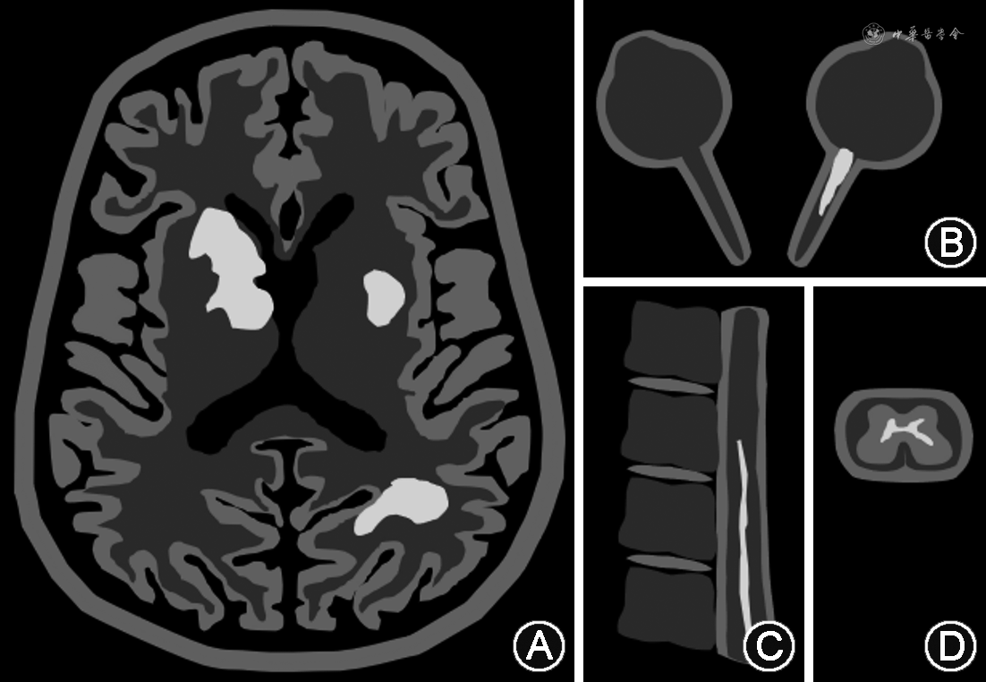 | 头颅MRI | 大而模糊成片、边界不清的病灶,皮质/近皮质病灶,深灰质、幕上、丘脑病灶[31] | 脑室周围分布,其他非典型病灶 | 侧脑室周围病灶,Dawson手指征,S或U型纤维,增强明显 |